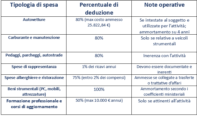 Gli agenti e rappresentanti che applicano il regime forfettario non possono dedurre analiticamente le spese sopra indicate, poiché beneficiano di una deduzione forfettaria pari al 39% dei ricavi (coefficiente di redditività 61%), come previsto dall’art. 1, commi 54–89, L. 190/2014.